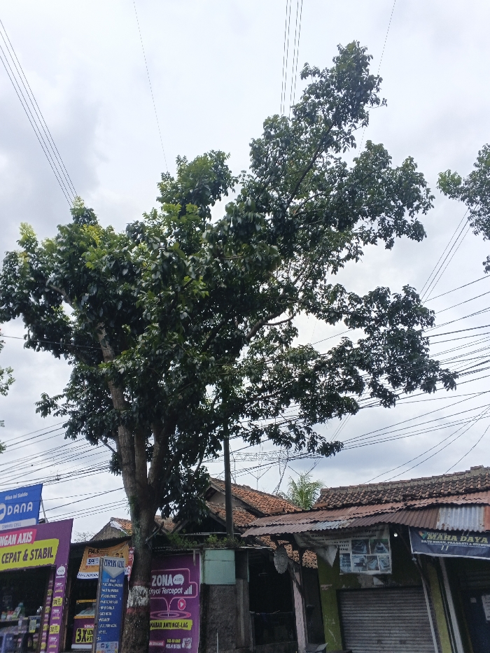 A large tree dominates the scene, its branches extending over a street lined with small shops and buildings. Overhanging power lines crisscross the sky above the tree. The shops feature various advertisements and signage in purple and white. The buildings have weathered rooftops with a mix of red tiles and corrugated metal. The overcast sky suggests an overcast day.