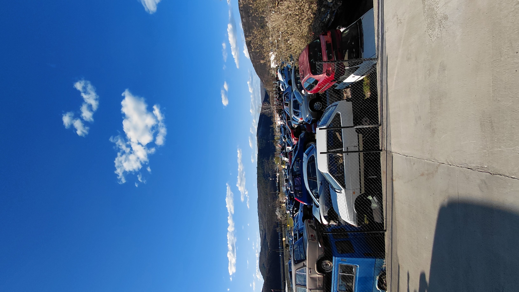 The image depicts a vehicle salvage yard under a blue sky with scattered cumulus clouds