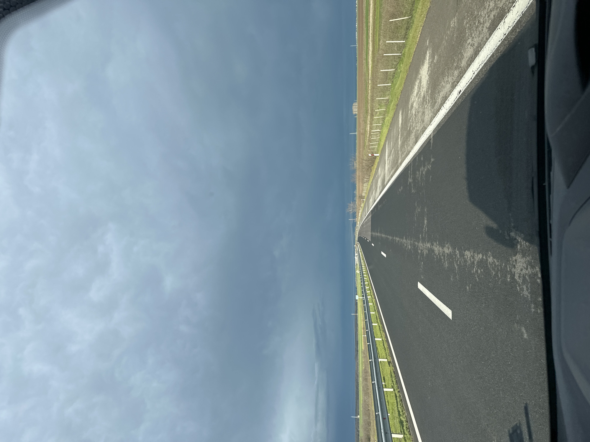 The image depicts a long, straight two-lane asphalt highway extending into the distance under a heavy, overcast sky, located in the vicinity of Sarnevo, Bulgaria. The sky is dominated by dark, dense grey and bluish-grey clouds, suggesting imminent precipitation or a heavily overcast day. The road surface appears dark grey with visible damp patches and reflections, particularly in the foreground and mid-ground. White dashed lines mark the center of the road, and solid white lines delineate both shoulders. On the left side of the road, a metal guardrail runs parallel to the highway, separating it from expansive green and brown fields that stretch towards the horizon. Sparse utility poles are visible in the far distance on this side. On the right side, a wider, unpaved or dirt shoulder with a series of white vertical marker posts (possibly delineators or short fence posts) borders the road. Beyond this, a vast, flat agricultural landscape with a mix of green and tilled brown fields extends to the horizon, where indistinct structures or buildings are faintly visible. The perspective is from inside a vehicle, looking forward through the windshield; the dark dashboard and a slight shadow or reflection from the vehicle's interior are visible at the bottom edge of the frame. There are no people or other vehicles immediately visible.