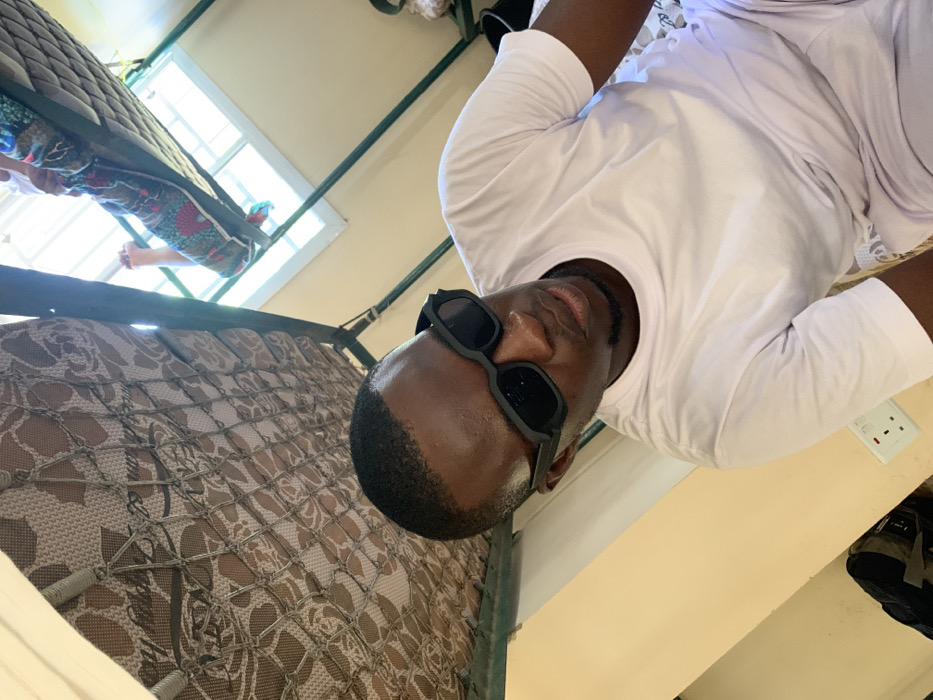 A Black male, approximately 20-30 years old, with short hair and a faint goatee, is depicted in an indoor room in Kubi A, Nigeria, likely a bedroom or dormitory
