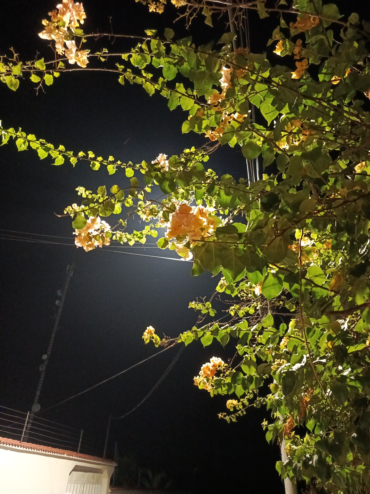 The image displays a section of a bougainvillea plant, located in Tinaco, Venezuela, during nighttime hours