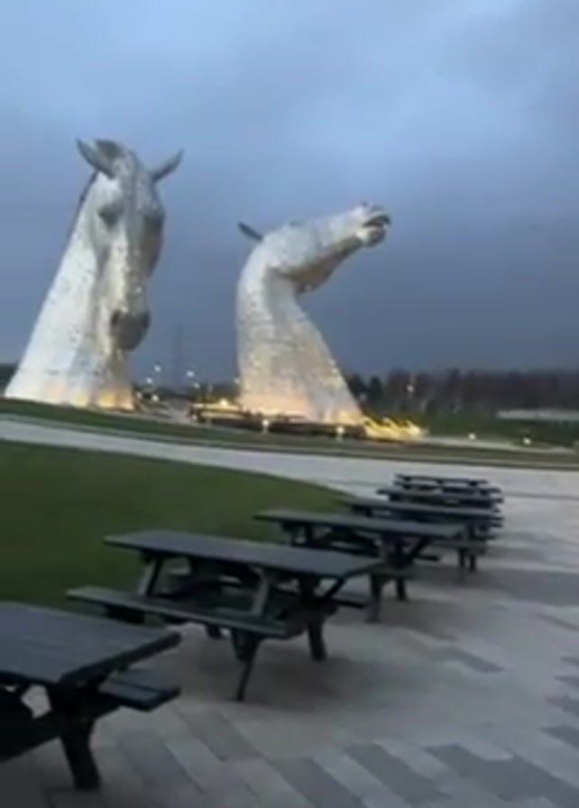 two large, metal horse head sculptures, likely the Kelpies in Scotland, standing on a green lawn under a cloudy, grey sky. Several dark-colored picnic tables are lined up on a paved area in the foreground. The sculptures are illuminated, and their surfaces appear to be composed of many small, reflective pieces. A few people are visible in the distance near the base of the sculptures.