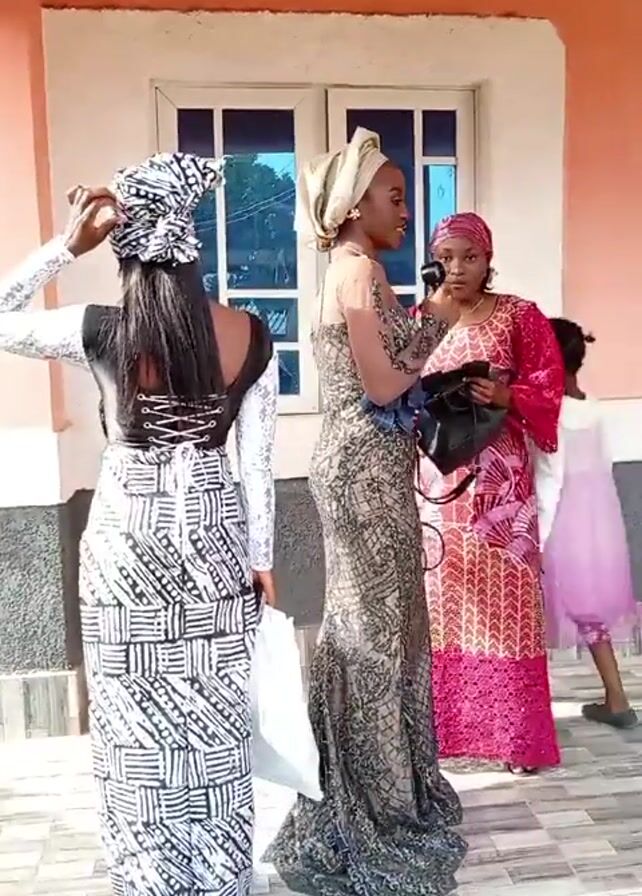 Three women stand outside a building, dressed in elegant patterned dresses and headwraps. The woman on the left wears a black and white dress and adjusts her headwrap. The woman in the middle is in a sheer gray dress with intricate patterns and holds a phone. The woman on the right wears a pink and red dress and is looking into a small black bag. The building behind them is painted peach, with white trim and a window. The floor is tiled. The setting appears to be a sunny day.