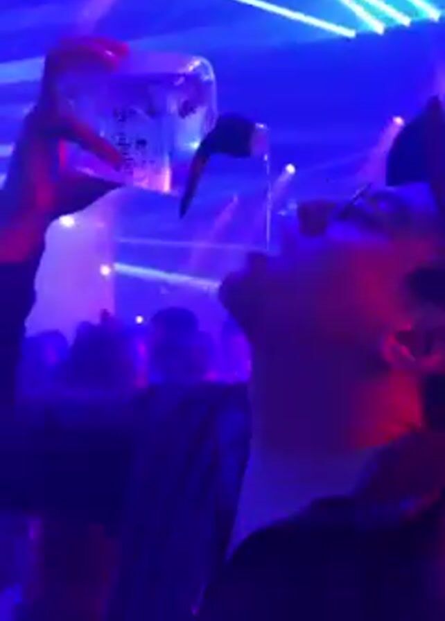 The video appears to be shot at a nightclub or event space with colorful, bright blue and pink laser lights