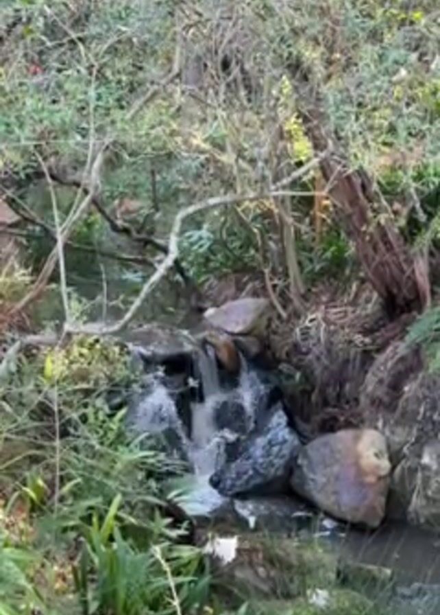 The video presents a tranquil view of a small stream or waterfall nestled amidst lush greenery. The water cascades gently over rocks, creating a soothing sound and visual. The surrounding environment is characterized by dense vegetation, including trees, shrubs, and grass, contributing to the natural beauty of the scene. The overall setting evokes a sense of peace and serenity, inviting viewers to immerse themselves in the sights and sounds of nature.