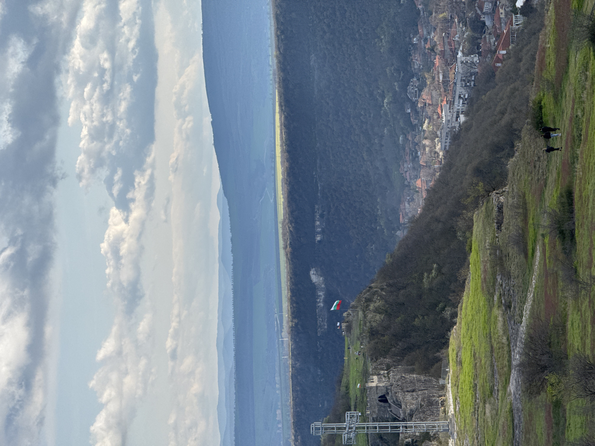 Captured from an elevated perspective, the image showcases the landscape around Provadia, Bulgaria. The left side of the frame features a cloudy sky and distant, hazy mountains. Adjacent to these is a long, narrow strip of open land running towards the horizon, bordered by a steep, tree-covered valley. On the right, part of the city of Provadia is visible, nestled along the edge of the valley. The foreground depicts a rocky, grassy slope with a large metal cross structure near the edge. Further up the slope, two figures stand on the grass. A Bulgarian flag is seen waving in the distance.