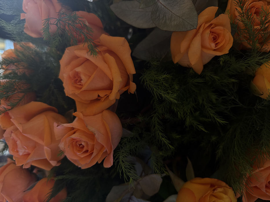 The image presents a close-up, matter-of-fact depiction of a floral bouquet, understood to be situated in the city of Puebla, Mexico. The composition is dominated by multiple peach-orange roses in various stages of bloom, with their layered petals forming the central visual elements. These roses are interspersed with dark green, finely textured, needle-like foliage, consistent with an asparagus fern or similar plant, which provides a dense, contrasting background texture. Additionally, broader, muted grey-green leaves, indicative of eucalyptus, are visible among the roses, particularly towards the left and bottom right sections of the frame. The lighting is soft, highlighting the petals and casting subtle shadows within the arrangement. No individuals are visible. There are no discernible actions or interactions beyond the static arrangement of the botanical elements. The immediate background is indistinct and dark, suggesting an indoor setting with limited depth of field.