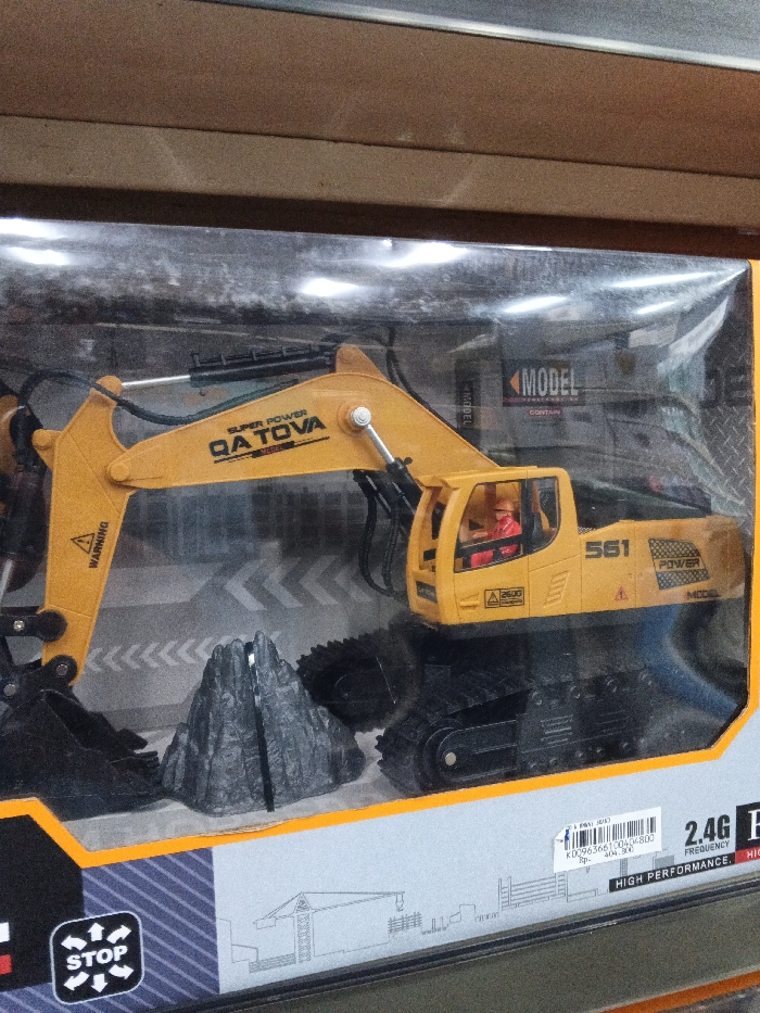 - "A toy excavator in its packaging features a bright yellow "QA TOVA" boom with a warning sticker, a gray rock-like accessory, and black treads" by FM-9JZNW2, licensed under CC BY 4.0