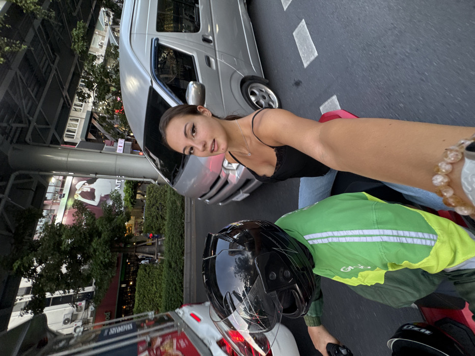 The image depicts an urban street scene in Bangkok, Thailand, featuring two individuals on a motorcycle amidst traffic, under an elevated concrete structure. A female passenger, with light skin and dark hair tied back, occupies the rear seat of a red motorcycle. She is wearing a black lace-trimmed camisole, light blue jeans, a silver necklace with a small pendant, and a light-colored beaded bracelet on her right wrist. Her right arm is extended, holding a smartphone, as she takes a selfie, looking directly at the camera with a slight smile. The motorcycle is operated by a driver, whose head is obscured by a black full-face helmet with a clear visor. The driver is wearing a green and neon yellow long-sleeved jacket with "Grab" branding visible, indicating a ride-hailing service provider. The driver faces forward, away from the camera. To the immediate right of the motorcycle, a silver passenger van with dark tinted windows is visible in traffic. To the left, the rear section of a white car is partially visible. The road surface is asphalt, featuring white painted lane or pedestrian markings. The background reveals a bustling urban environment. A large concrete pillar supports an elevated structure, likely an overhead road or a Skytrain line, which is characteristic of Bangkok. Beyond the traffic, multi-story buildings line the street, some with visible commercial lighting or displays. Green trees and hedges are present along the roadside. A large billboard or building advertisement on a distant building features a stylized image of a woman in a white cap. The overall lighting suggests late afternoon.