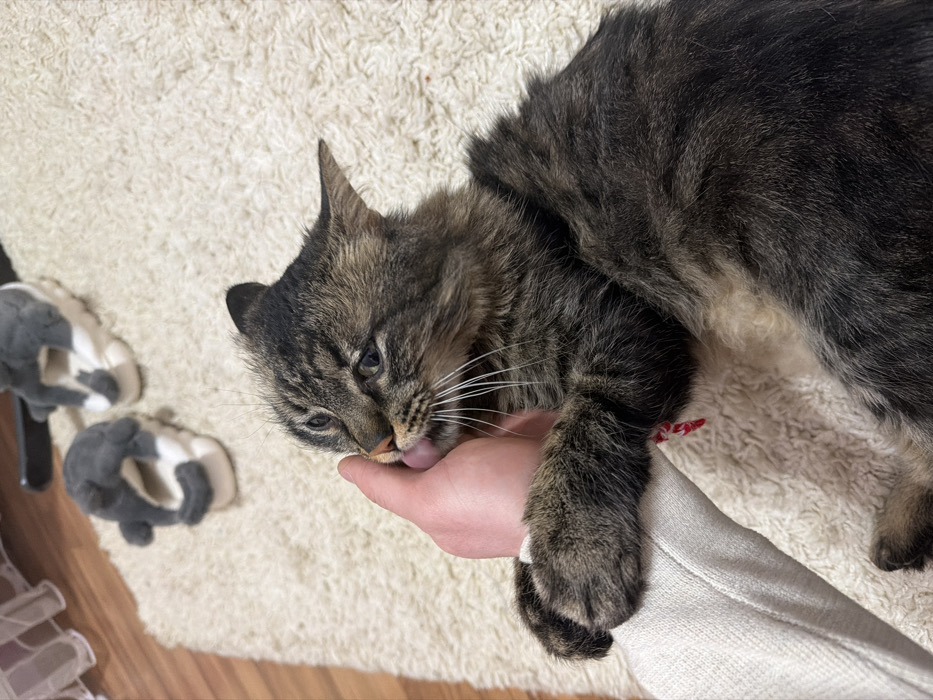 A domestic tabby cat, predominantly dark brown and black striped with lighter brown and beige fur on its underside, is captured in a close-up indoor scene in Karlovo, Bulgaria. The cat, lying on a cream-colored shag carpet, is actively licking the index finger of a human left hand. Its right front paw rests on the human's forearm, which is clad in a light-colored, possibly knit, long-sleeved garment. A red and white patterned collar is partially visible around the cat's neck. In the background, out of focus, two grey and white shark-shaped plush slippers are positioned on the carpet, with a section of wooden floor visible behind them.