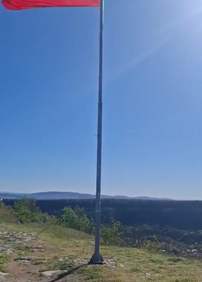 The video begins with a low-angle view of the Bulgarian flag waving atop a tall pole against a bright blue sky. The camera then pans down to reveal a panoramic view of a town nestled in a valley, surrounded by green hills. The town is densely populated with buildings, mostly with red-tiled roofs. The sky is clear and sunny. The foreground is a grassy area with a stone pathway.