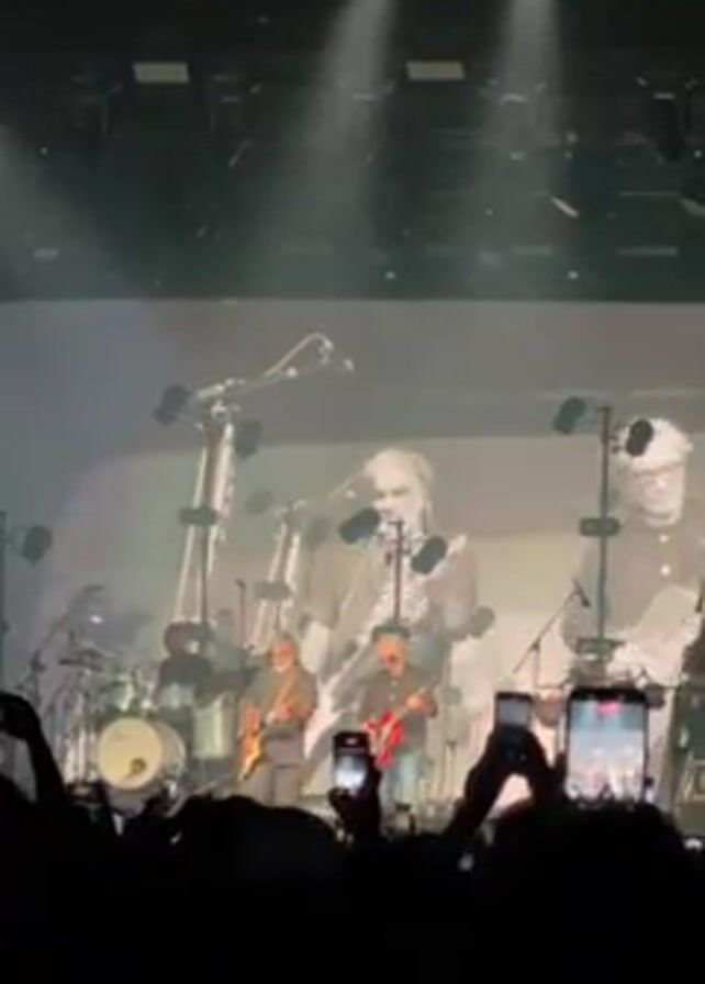 A band performs on a large stage with a black and white video playing on a screen behind them. Several spotlights shine from above. The stage features drums, microphones, and guitarists. The video screen shows older images of the band members playing. The audience, visible only as dark silhouettes, holds up phones to record the performance. The environment is dark, emphasizing the stage lighting and screen.