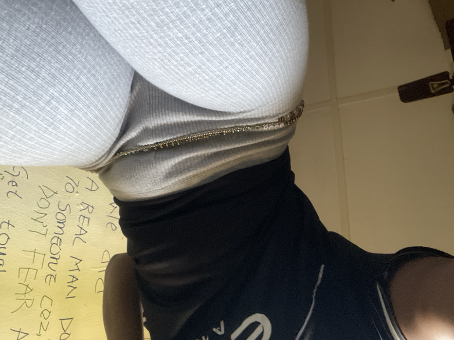 The image displays a low-angle perspective of an individual and their immediate surroundings. The upper right portion of the image shows the torso and upper leg of a person wearing light gray, ribbed fabric. A gold-toned chain with small, reflective beads is visible draped across the person's midsection. The lower left portion shows the left shoulder and upper arm of the same person, wearing a black top with a partial white design resembling a "U". The background features a yellow-painted wall with black handwritten text, which appears inverted due to the image's orientation. Visible phrases on the wall include "A REAL MAN", "TO SOMEONE COZ", "DON'T FEAR", "GET EQUAL", and "RIP". Below the yellow wall, a lighter-colored wall or surface is visible, showing horizontal and vertical seams. A dark brown object, possibly furniture or a fixture, is present in the bottom right corner. The specific location within Ajaokuta, Nigeria, cannot be determined from the visual evidence provided.