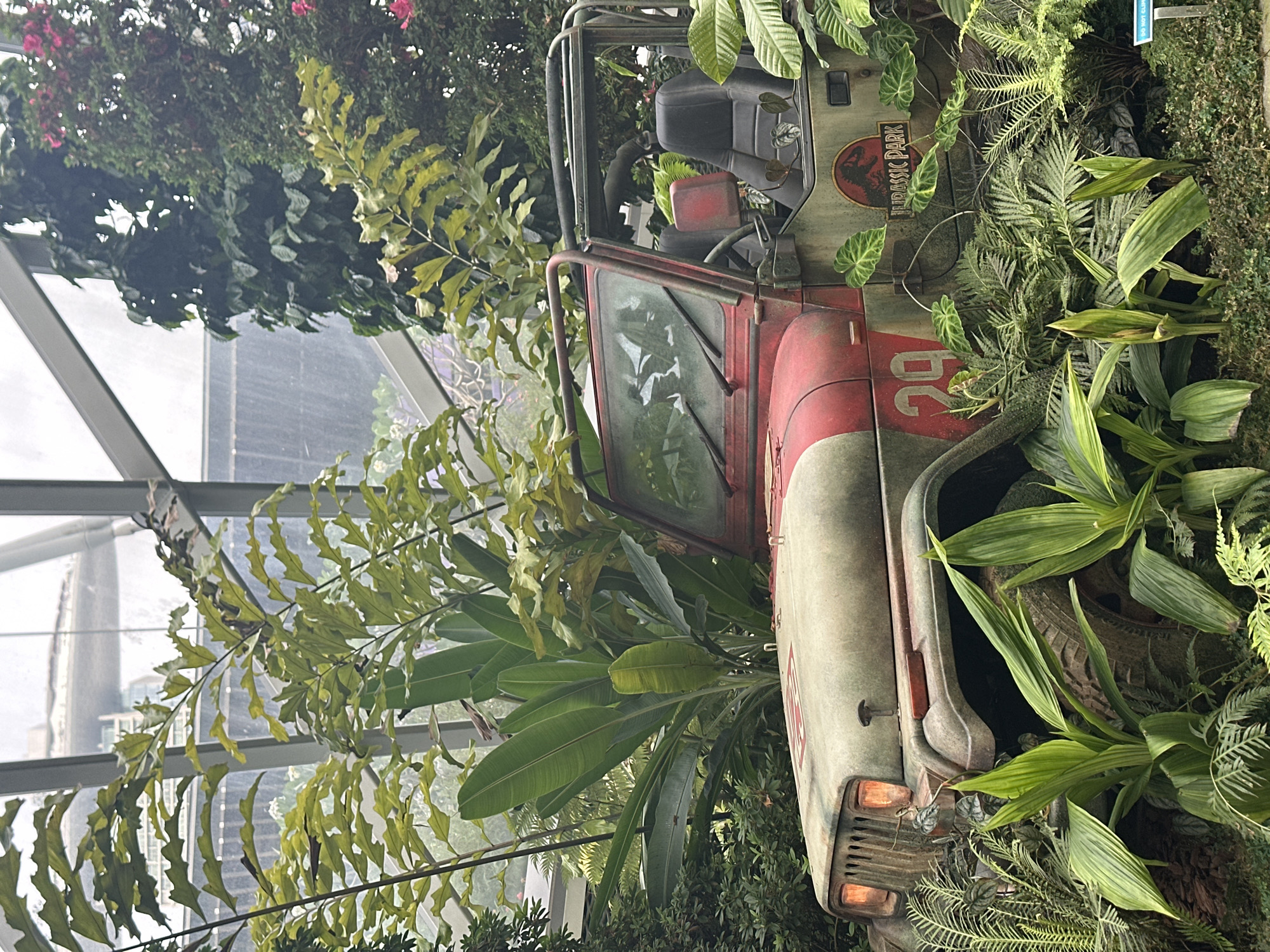 - "A static, weathered Jeep, styled as a "Jurassic Park" vehicle, is depicted partially submerged within dense tropical vegetation" by FM-9iDyv1, licensed under CC BY 4.0
