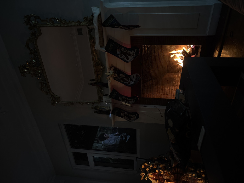 A dimly lit room features a grand, gilded mirror reflecting the space. Above a modern fireplace with a burning fire are hung festive stockings. Below, a television screen displays a scene. Ornate decorations sit on a nearby table. The scene is dimly lit.