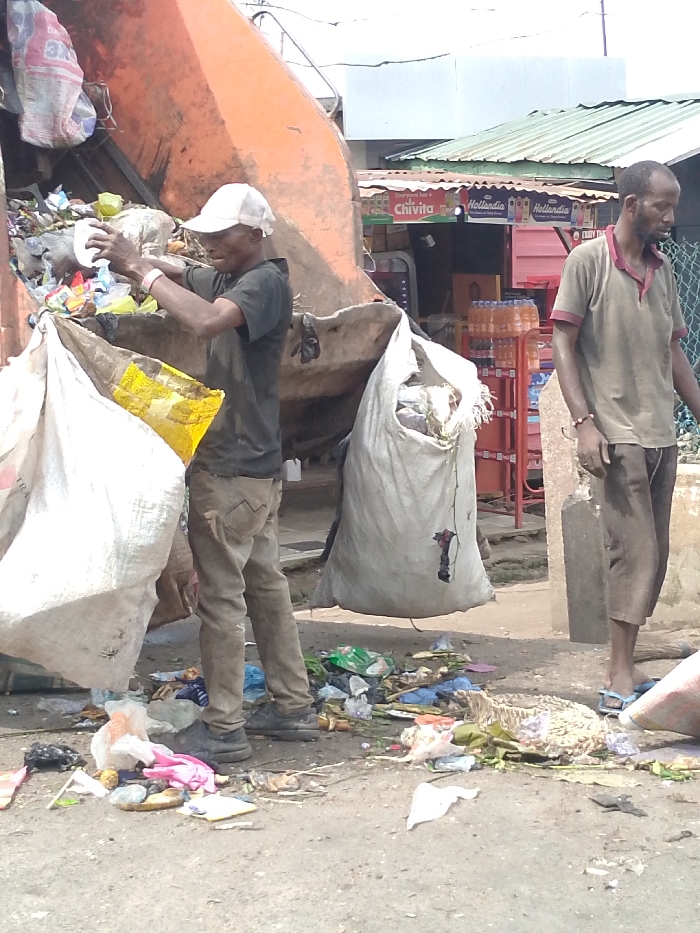 The scene depicts a waste collection point on a commercial street in Lagos, Nigeria