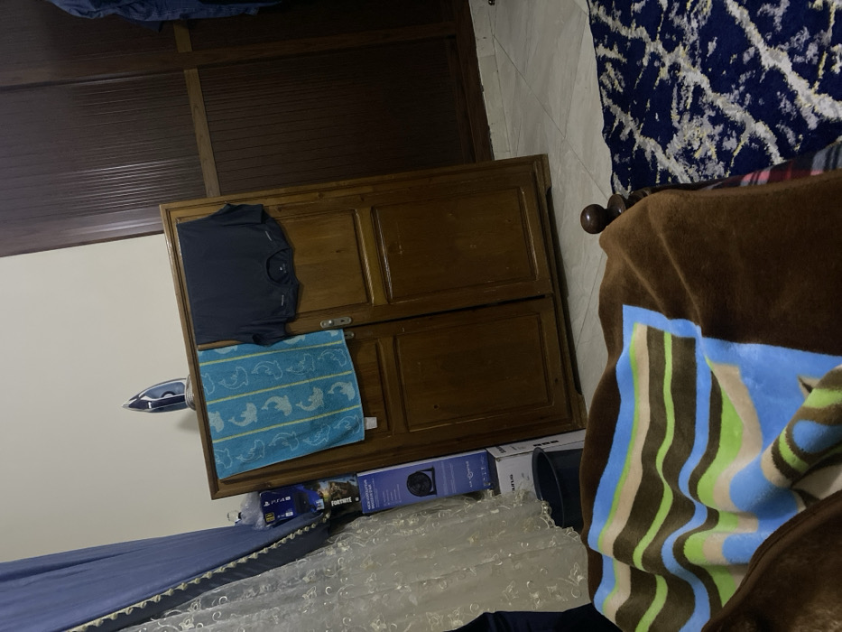 A wooden cabinet with a dark shirt and blue dolphin-patterned towel hanging on the front. A blue PlayStation box and a Fortnite box are visible below the cabinet. An iron is on the left. A bed with a blue sheet and white cover is in the foreground. A brown blanket with blue and green stripes is draped over a chair on the right. The ceiling is brown. A blue and white rug is visible in the upper right corner.