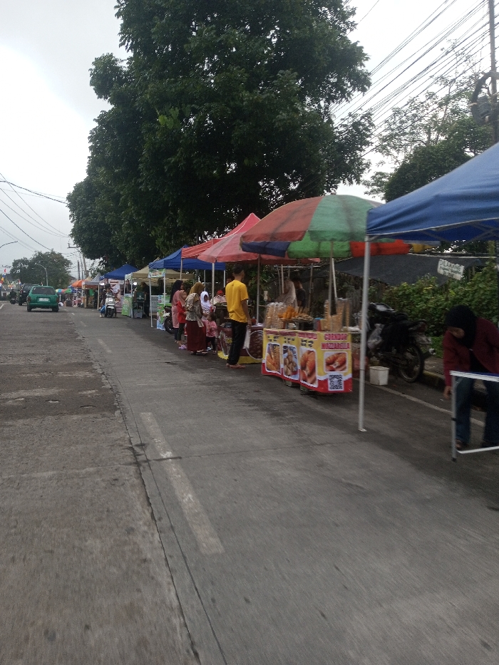 The scene depicts an outdoor street market, purportedly in Tangsibi, Bhutan; however, visual evidence, including prominent stall signage in Indonesian (e.g., "Gorengan," "Mozzarella") and general architectural style, is inconsistent with a Bhutanese location and suggests a Southeast Asian setting. The environment is characterized by an overcast sky and a broad, dark grey paved road with faded white lane markings. Tall, dense green trees line the left side of the road, with a network of overhead utility wires visible against the sky. On the right, a series of at least eight temporary market stalls with colorful tarp canopies (blue, red, red/green striped) are set up along the roadside. The closest stall on the right features a red and green striped canopy over a white-framed vendor cart. This cart displays yellow and red signage advertising "GORENGAN" and "MOZZARELLA," with images of fried food items like fritters. Various food products, including what appear to be fried snacks and corn-on-the-cob, are arranged on the stall's surface. Further down the line, other stalls display diverse goods. Multiple individuals are present. On the far right, a person wearing a dark headscarf and a reddish-brown garment is partially visible, leaning forward. Near the prominent red/green stall, a man in a yellow t-shirt stands facing left. Further along the row of stalls, several individuals, including women (some wearing headscarves) and a small child, are observed standing or walking, engaging with the market. One woman in a pink top is seen holding a child. Vehicles include a green sedan or small SUV driving away from the camera in the left lane. A dark motorcycle is parked beside a stall on the right, and a white scooter is visible parked further down near another stall. No distinct direct interactions like transactions are clearly discernible.