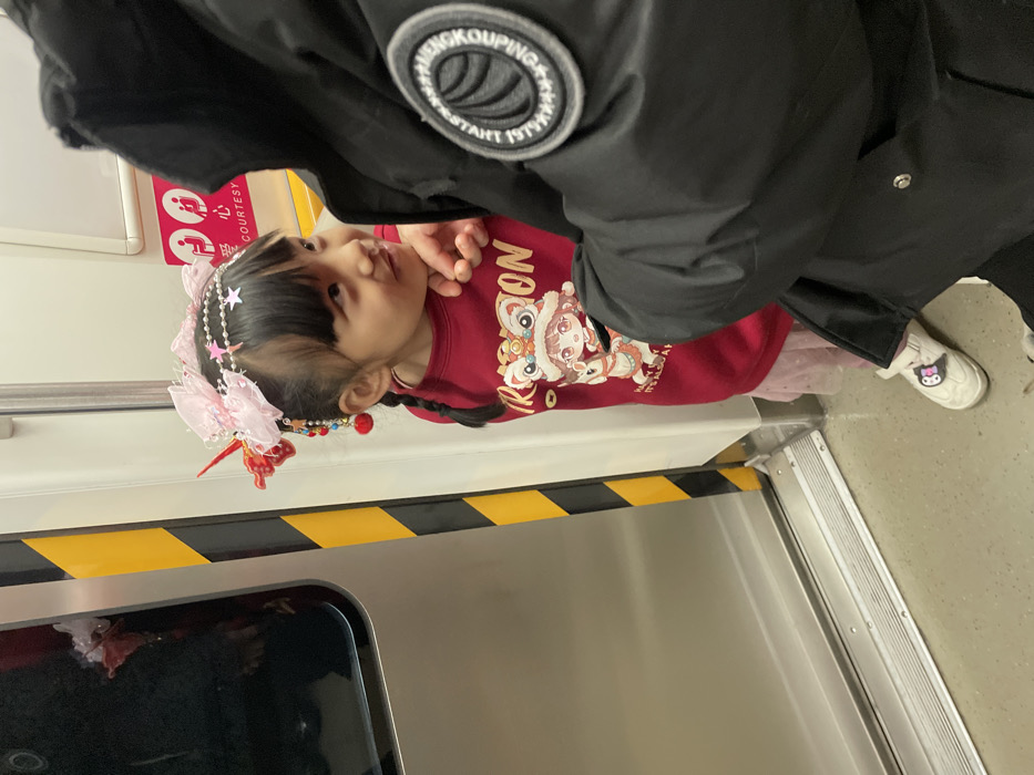 A young girl stands in a train, wearing a red sweater with a cartoon character. She has an elaborate headband with bows and decorations. A person in a black jacket stands nearby. The train's interior is visible, with yellow and black safety markings on the floor. The girl is wearing white shoes with a cartoon character. The train window and door are partially visible.