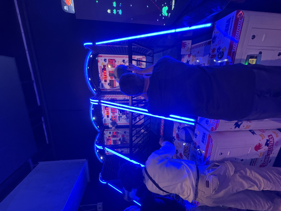 This image captures an indoor scene within an entertainment establishment in Saint-André-lez-Lille, France, characterized by predominantly blue neon lighting. Three individuals are visible, interacting with a row of "Sonic All-Stars" basketball arcade machines. The environment is dimly lit, with dark walls and ceiling, illuminated primarily by the vibrant blue LED strips outlining the frames of the arcade games. On the far right, a vertical arcade cabinet displaying a "Space Invaders"-style game with pixelated aliens is partially visible. In the foreground, a person wearing a dark t-shirt and dark pants is positioned at the middle basketball machine. This individual holds a small basketball with both hands, aimed towards the hoop, indicating an active play session. To their left, another person, wearing a white long-sleeved shirt and light-colored cargo pants with visible pockets, stands at the leftmost basketball machine, appearing to lean forward over its console. A dark strap, possibly from a bag, crosses their back. The console for each machine features "SEGA AMUSEMENTS" branding and "SONIC ALL-STARS" graphics. Digital scoreboards on each machine display "SCORE," "TIME," and "HIGHEST" in red numerals, with one displaying "59" for score and "33" for time. A third person is partially visible on the far left, their left shoulder and arm in dark clothing. The machines are designed with a backboard, a hoop, and a ball retrieval system.