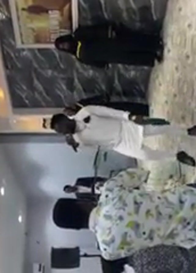 Several people are dancing in a large room. One person, dressed in white, is holding a microphone and appears to be singing. The room has marble-tiled floors and decorative lighting on the ceiling. There are speakers and a poster on the wall. The video is filmed vertically.