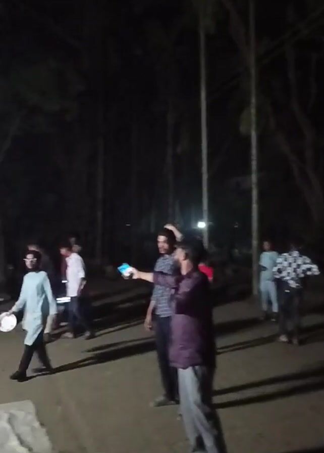 group of people outside a building at night. The building has a red and white facade. Some of the people are standing near the building, while others are walking around in an open area. Some of the people are looking at their phones. There are tall, thin trees in the background. It is dark and the area is lit by artificial lights.