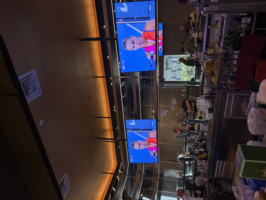 This image depicts the interior of a modern bar or restaurant located in South Jakarta, Indonesia. The overhead ceiling is dark brown with a perimeter of warm orange accent lighting and several square air conditioning vents. Two large flat-panel televisions are suspended from the ceiling by dark metal structures, both displaying a tennis match from the Australian Open, with "beIN SPORTS" branding visible. The primary subject on screen is a female tennis player, Aryna Sabalenka, wearing a pink and orange athletic top, with a score overlay indicating "SABALENKA" leading "SVITOLINA". Below the screens, a stainless steel bar counter stretches across the midground, equipped with multiple beer taps, numerous bottles of spirits, and various glassware. A male bartender, wearing glasses and a dark green shirt, is positioned behind the bar on the left, facing right. Another male patron, bald and wearing a black shirt, sits at a high-top table directly behind the bartender. Further to the right and in the background, several more patrons are seated at tables, one wearing a plaid shirt. Through a large glass entrance or window on the right, an exterior view reveals a modern building with a textured, grey facade and some green foliage, suggesting an urban environment. A male in a suit jacket is visible near this exit. On the far left of the bar, a green box labeled "Glengoyne" is visible on a lower shelf. The overall scene indicates a casual social setting where patrons are watching televised sports.