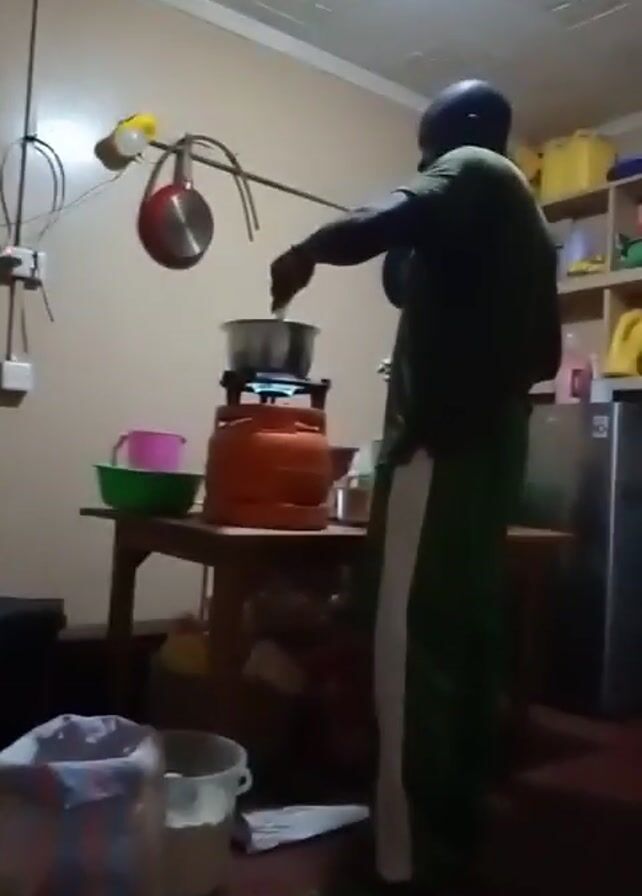 A man in green clothing is stirring a pot on a portable gas stove in what appears to be a kitchen. The stove sits on a wooden table, alongside a green bowl and other containers. Behind the man is a refrigerator and a shelf containing yellow containers. A bag of flour is visible in the foreground. The man's actions suggest he is cooking. The lighting is dim, and the room has a basic, functional appearance.
