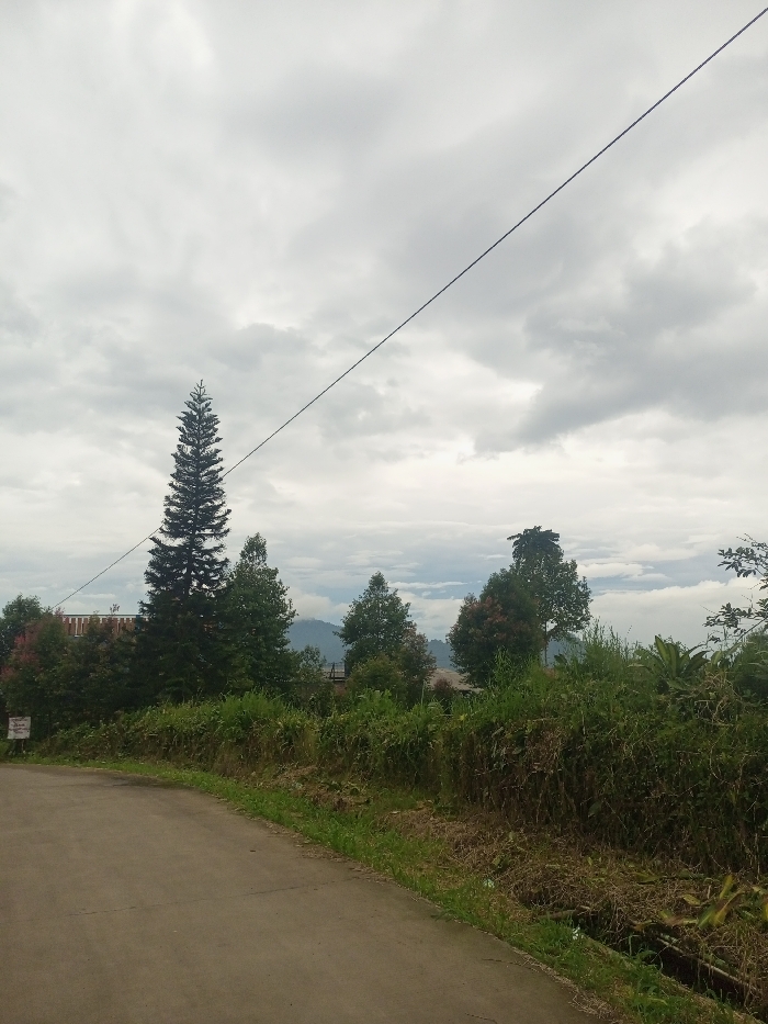 A winding road is lined by green vegetation under a cloudy sky. Several trees punctuate the landscape, including a tall, slender pine. Overlapping greenery partially obscures a structure in the distance. A power line bisects the upper portion of the scene. The overall atmosphere is overcast and muted in color. A ditch can be found on the right side of the image.