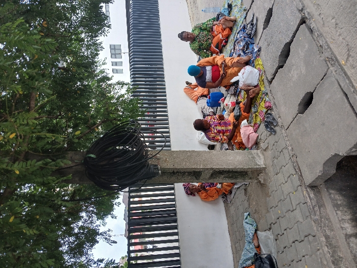 The image displays an outdoor street scene in Moba, Nigeria, featuring five individuals gathered under a large tree during daylight hours. The ground in the foreground is composed of gray interlocking concrete pavers, transitioning to rough concrete slabs covering an open drainage channel with visible apertures and cracks. A substantial concrete pillar stands centrally, supporting the tree's canopy, and a large coil of black electrical or communication cable is wrapped around its base. In the background, a dark gray slatted metal fence surmounts a white wall, behind which white, multi-story buildings are visible. Five adult individuals, identified as women, are present, seated on various patterned mats or fabrics spread across the paved surface. From left to right: 1. An individual is partially obscured by the concrete pillar and a patterned blanket (blue, white, orange) while reclining or lying on the ground. A black bag rests near their head. 2. A woman wearing an orange outfit and a purple head wrap is seated upright, hands engaged with an unseen object in her lap. 3. A woman in a multi-colored patterned top and orange trousers is seated, looking downwards. A small white plastic bag and a pair of black slippers are positioned near her feet. 4. A woman wearing a blue head covering, a striped top, and orange trousers is seated, focused on a small electronic device held in her hands. A blue plastic jerrycan is located behind her. 5. A woman in a green patterned top and orange trousers is seated on the far right, looking towards the center of the group. A clear plastic water bottle is near her. All visible women are barefoot. The individuals are positioned in the shade provided by the tree.