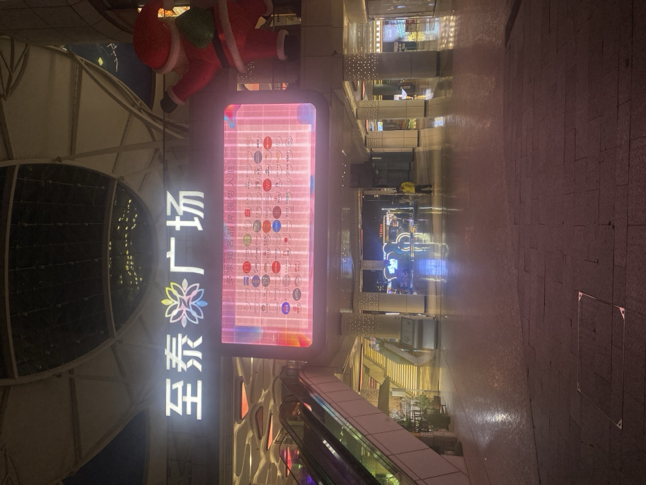 The image displays the illuminated entrance area of Zhitai Plaza (至泰广场) at night, located in Huangpu District, China. A large overhead sign prominently features the plaza's name in Chinese characters, "至泰广场," alongside a colorful, stylized lotus emblem. Directly below this, a large rectangular LED screen exhibits various circular brand logos against a vibrant, multi-colored background, with Chinese text indicating the presence of multiple well-known brands. To the left, a pair of operational escalators ascends, illuminated by warm yellow lights. Below the escalators, potted plants and shaded outdoor seating are visible. On the upper right, a large, illuminated red Santa Claus figure, holding a green bag, is affixed to the building's facade, serving as a seasonal decoration. The ground level consists of a tiled floor that appears wet and highly reflective, mirroring the numerous overhead and ambient artificial lights. Several substantial structural columns, some adorned with small decorative lights, support the building's upper levels. In the center-mid ground, a single individual is observed standing, wearing a distinct bright yellow jacket, facing the interior of the plaza. The background reveals additional brightly lit commercial spaces and decorative elements further inside the complex. The overall environment is well-lit by artificial sources, indicating a commercial establishment after dark.