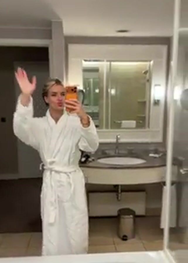 person in a bathroom wearing a white bathrobe. They are taking a selfie in a large mirror. In the background, there's a bathtub filling with water, a vanity with a sink and mirror, a trash can, and a door to another room. The person waves and poses for the selfie.