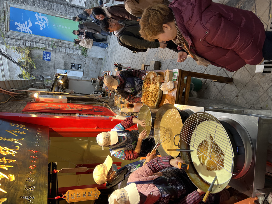 This image captures a street food scene in Yuzhong District, China, characterized by active food preparation and pedestrian traffic. In the immediate foreground, a food stall is in operation. Four individuals, presumed to be vendors, are visible, all wearing hats and aprons. Three are directly engaged in cooking tasks using large woks. The vendor on the far left, wearing a white hat, holds a thermometer submerged in a wok containing a light-colored liquid. Next to them, another vendor, wearing a beige hat and blue patterned apron, uses a metal spider strainer to agitate items in a second large wok filled with a thick, yellowish liquid. To their right, a third vendor, also in a beige hat and blue apron, arranges golden-brown, fried items in a large, round woven basket set on a small wooden table. This table also holds various small containers of sauces and a green QR code sticker. Above the stall, red storefront panels display gold Chinese characters, including "传统美食店" (traditional food store), and a yellow hanging sign advertises "红苕粑" (sweet potato cakes) at "6元/个." The street is paved with light-colored, patterned tiles. On the right side of the frame, a woman in a maroon puffer jacket stands, facing right, holding a small white stick, possibly a skewer or toothpick. Behind her, a young man wearing a dark green jacket and a backpack looks towards the viewer. Further down the street, additional pedestrians are observed walking and interacting. The street is enclosed by multi-story brick and stone buildings. On the right-hand wall, a prominent vertical blue banner with white Chinese characters reading "美好" and "UEIUA" is displayed. Below it, a rectangular grey sign with "80 魁" is affixed to the stone. Overhead, multiple black electrical cables traverse the scene. A multi-layered stone structure is partially visible in the distant background, suggesting an older building. The scene is brightly lit by ambient daylight.