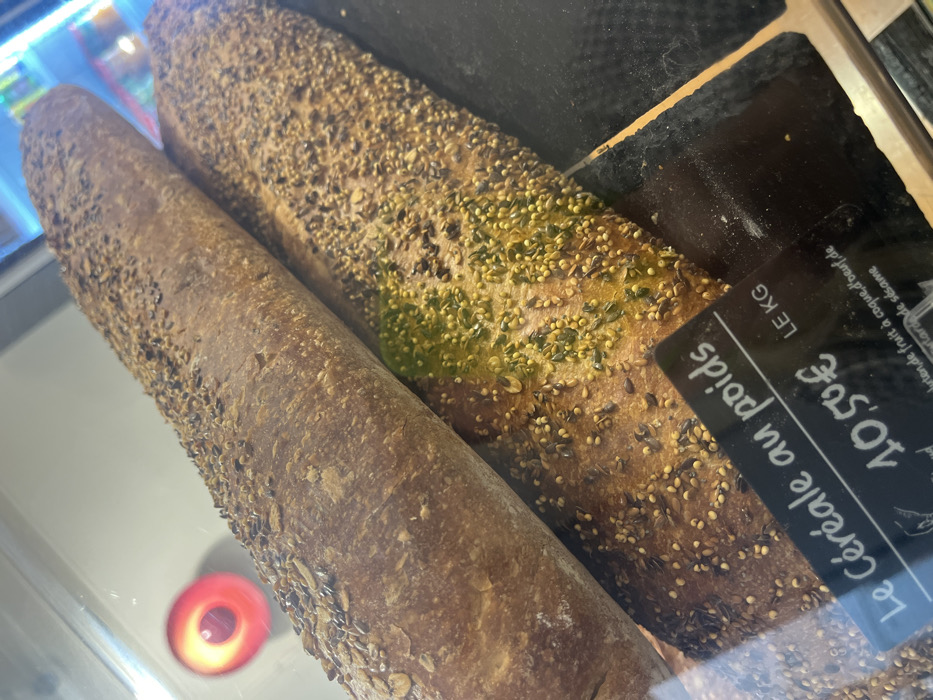 - "Two elongated, seed-crusted loaves of bread are prominently displayed within a clear glass retail case, likely in a bakery or food shop in Cannes, France" by FM-eWTi73, licensed under CC BY 4.0