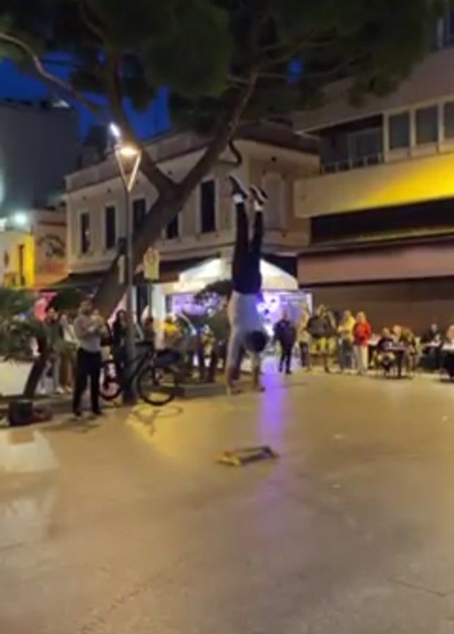 A person is doing a handstand on top of a balance board in a town square. The performer is dressed in a t-shirt, dark pants, and white sneakers. The square is paved with light-colored tiles. A dark-colored tree stands to the left of the performer, with a few people watching the performance from nearby. Buildings surround the square, including a two-story building with multiple windows, and a restaurant tent. The performance is illuminated by street lights and purple lighting on the balance board. A black bicycle leans against a wall on the left side of the frame. There is an audience watching the performance.
