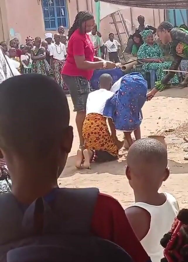 traditional ceremony taking place in an open, sandy area, with a pink building in the background and a white tent structure behind a crowd of onlookers. A person in a white shirt and orange patterned wrap kneels on the ground facing a small clay pot. Another person in a blue patterned wrap also kneels nearby. A woman in a red shirt stands behind them, possibly directing the ritual. A person holding a wooden stick appears to be striking the pots. The crowd, consisting of adults and children, watches the ceremony, many dressed in traditional attire. The video seems to be taken from a low angle, with the backs of the heads of some of the spectators in the foreground.