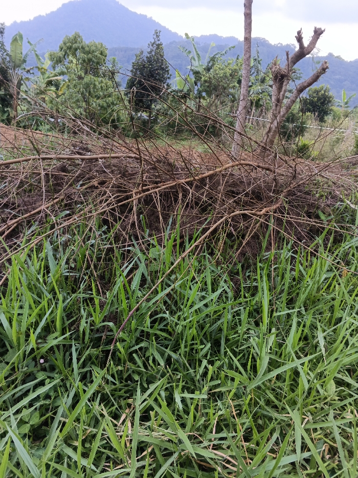 This image depicts an outdoor landscape scene located in Chengdu, China. The foreground is dominated by dense, vibrant green grass. In the midground, a large, irregularly shaped pile of dry, tangled brown branches and brush is present. Directly behind this brush pile, several trees are visible, including a tall, slender, light-barked tree trunk and a wider, multi-branched tree stump with clearly cut limbs. The background features a dense collection of green foliage, including broad-leafed plants resembling banana trees, set against the base of a large, dark green mountain range. The sky overhead appears overcast. No individuals, animals, vehicles, specific actions, or interactions are present in the frame.