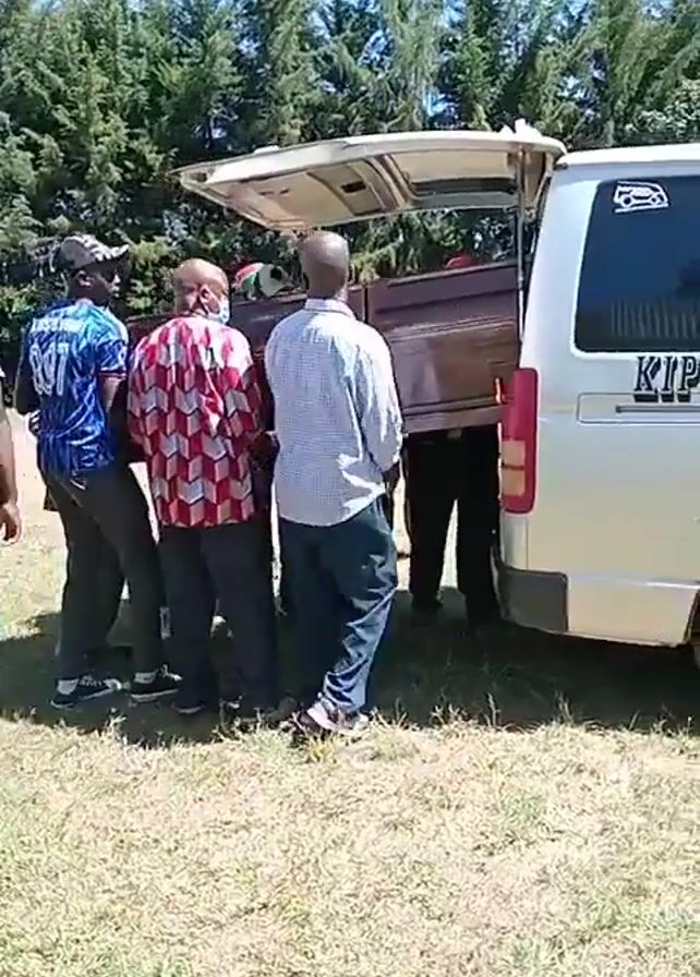 Several people are seen carrying a coffin from a silver van with its trunk open. The van is labeled "KIPKAR," and the scene appears to be set outdoors on a sunny day, with trees in the background. The men wear casual clothing, and one is wearing a face mask. They are working together to move the coffin from the vehicle. The ground is covered in grass.