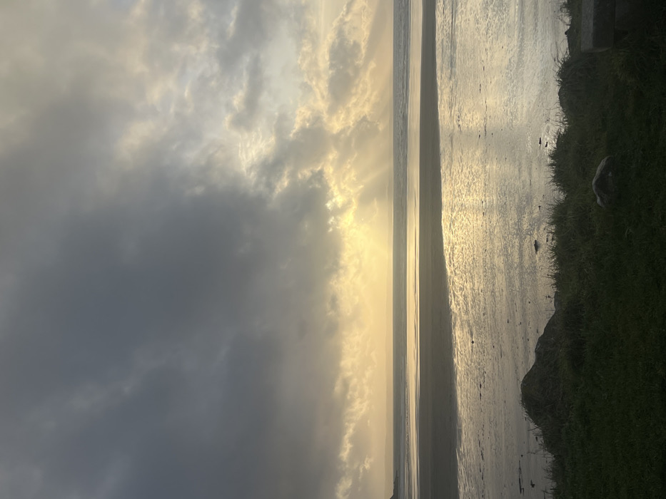 A beach scene unfolds with a golden glow. The sky is filled with dark and light clouds, the sun peeking through in the center. The beach extends into the distance, reflecting the golden light. Grass and some rock formations line the edge of the beach on the right side of the frame.