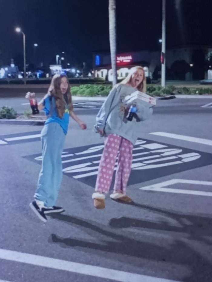 The image depicts two young females in mid-air over a paved surface at night, located in the city of Kukcha, Uzbekistan. The female on the left, with long light brown hair, wears a light blue t-shirt, light blue pants, and black and white athletic shoes. She holds a dark-colored bottle with a red label, identifiable as Coca-Cola, in her raised left hand, and her mouth is open in a wide expression. The female on the right, with long blonde hair, wears an oversized light grey sweatshirt, pink polka-dotted pants, and light brown fuzzy slippers. She carries several stacked white pizza boxes with red markings in her left arm, and her mouth is also open in a wide expression. Both individuals are positioned as if jumping, with their feet off the ground and casting elongated shadows on the dark grey pavement. The pavement features white painted markings, including a rectangular design with internal horizontal lines. In the blurred background, artificial lighting illuminates distant buildings, one with a red facade, along with streetlights and palm trees.