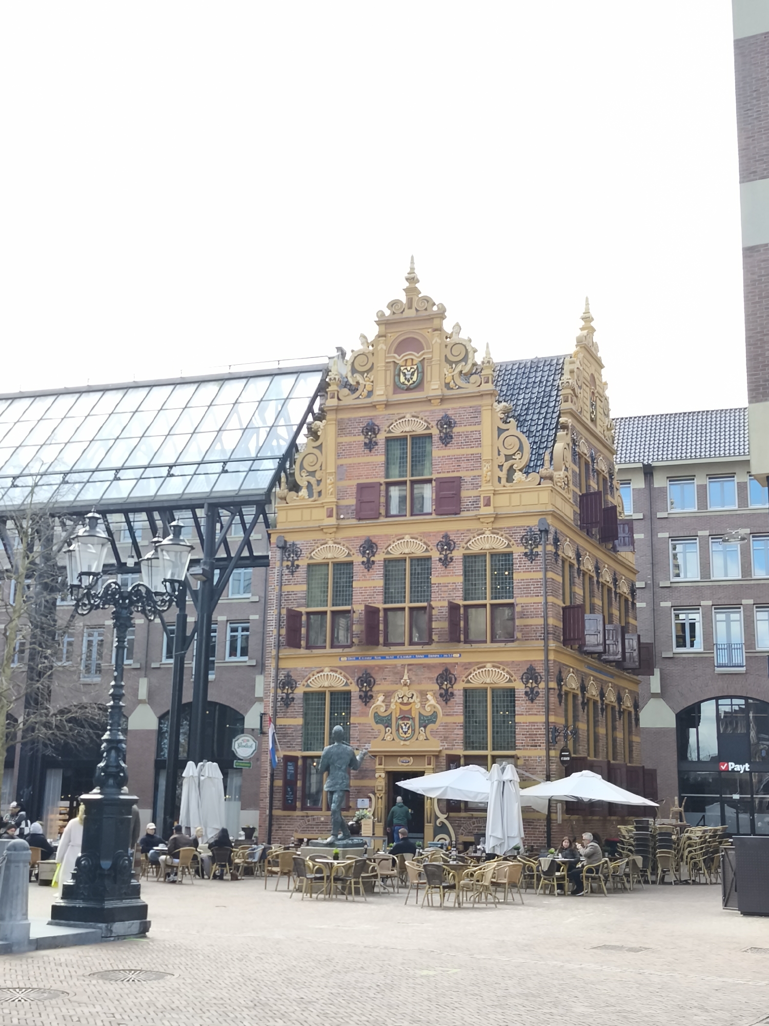 The image displays an urban square, identified as Waagplein in Groningen, Netherlands, with the prominent historic Goudkantoor building. The Goudkantoor, a multi-story Dutch Renaissance structure, occupies the central frame, featuring a red brick facade with extensive golden-yellow sandstone ornamentation, multiple windows, dark red shutters, and a steeply pitched dark tiled roof. A bronze statue of a standing man, identified as Ubbo Emmius, is positioned directly in front of the Goudkantoor. To the left of the Goudkantoor, a modern building with a large glass-sloped roof and brick lower sections is visible. To the right, another multi-story brown brick building with multiple windows and a "Payt" sign at ground level is present. The square's surface is paved with light-colored pavers. In the immediate foreground on the left, an ornate black lamppost stands. An outdoor dining area is established in front of the Goudkantoor, comprising numerous wicker-style tables and chairs. Many chairs are stacked, and tables are mostly unoccupied, though approximately 10-15 individuals are seated at scattered tables, engaged in apparent social interaction or dining. Several large white patio umbrellas, some open and some closed, are situated within this area. One individual in a light-colored coat walks in the mid-ground left. The sky is uniformly overcast and light grey, indicating diffused daylight conditions.