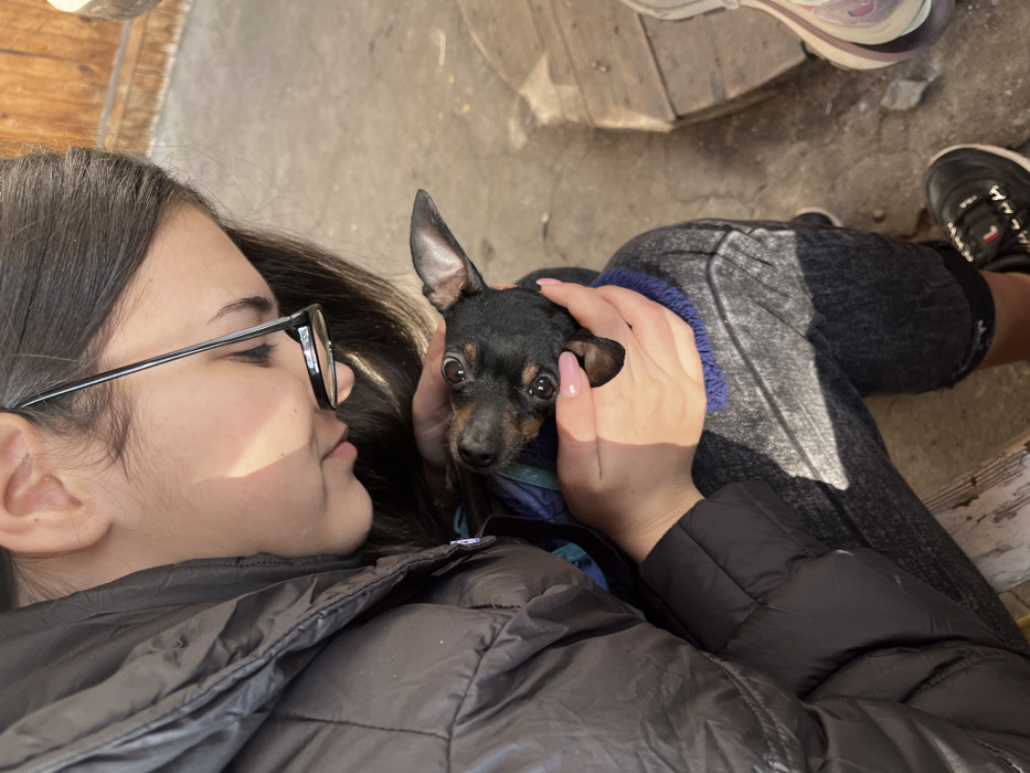 A young adult female, with long dark hair and black-framed eyeglasses, is shown from a high angle, leaning towards and holding a small dog. She is wearing a black quilted jacket and dark grey trousers. Her hands, with light pink polished nails, are gently cupping the head of a small, black and tan dog. The dog is wearing a blue and green patterned garment and is looking upwards with large, dark eyes and erect ears. The setting is outdoors, illuminated by direct sunlight which creates defined shadows. The ground beneath is concrete, and a portion of a light-colored wooden structure is visible in the upper right background. The specific location within Sofia, Bulgaria, is not discernible from the image.