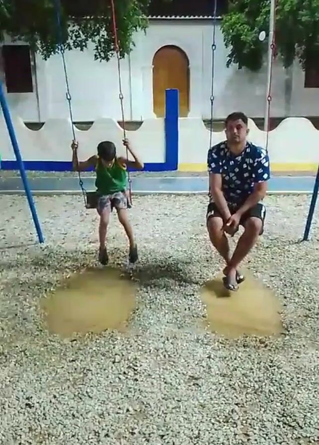 A boy and a man are sitting on swings next to each other at a playground. The boy wears a green tank top and shorts and is swinging slightly. The man wears a patterned navy shirt and shorts and sits still. They are both in front of a white building with blue trim and a wooden door. The ground is covered with light grey pebbles and there are puddles under the swings. Several green trees are visible in the background. It is dark outside.