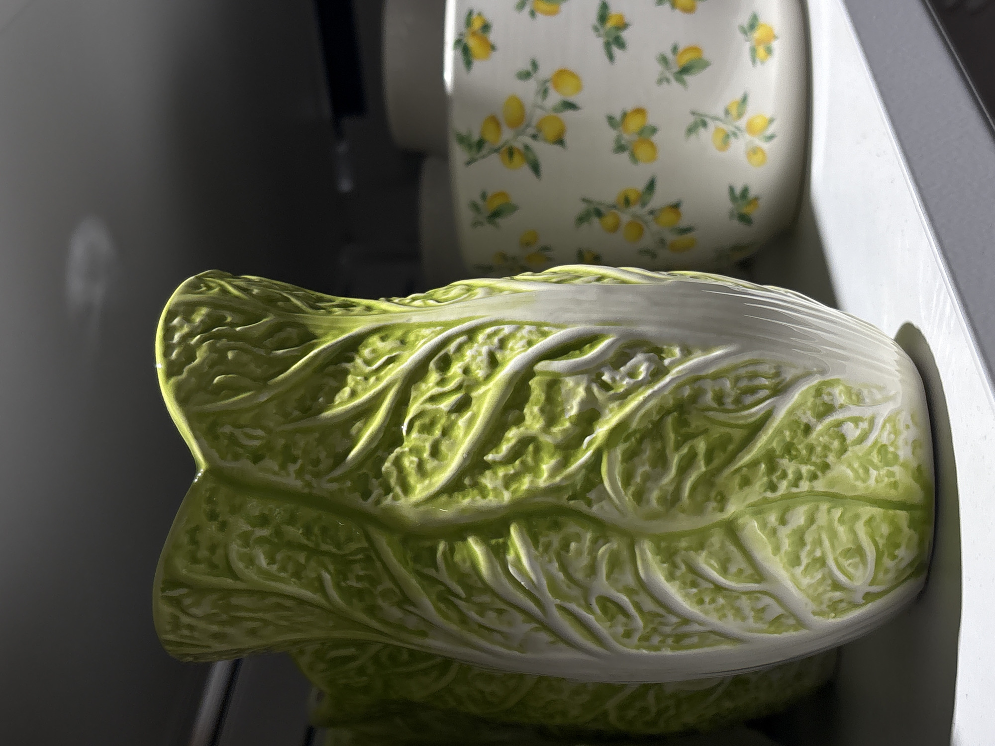 The image depicts an indoor scene focused on decorative ceramic objects displayed on a white shelf. In the foreground and center-left, a light green and white ceramic vase is prominently featured. This vase is designed to resemble a head of savoy cabbage or lettuce, with a textured surface showing raised white veins and ruffled light green leaf-like areas. The rim of the vase is irregularly shaped, mimicking the top edge of a vegetable. To the right and slightly behind, a second, out-of-focus white ceramic container is visible. This container is patterned with multiple clusters of small yellow lemons accompanied by green leaves. The objects are illuminated from the upper left, creating distinct highlights on the raised textures of the main vase and casting shadows. The background above the shelf is dark and lacks discernible features. No individuals are present, nor are any actions or interactions depicted. There are no visual cues within the image to identify a specific location within the city of Kragujevac, Serbia.