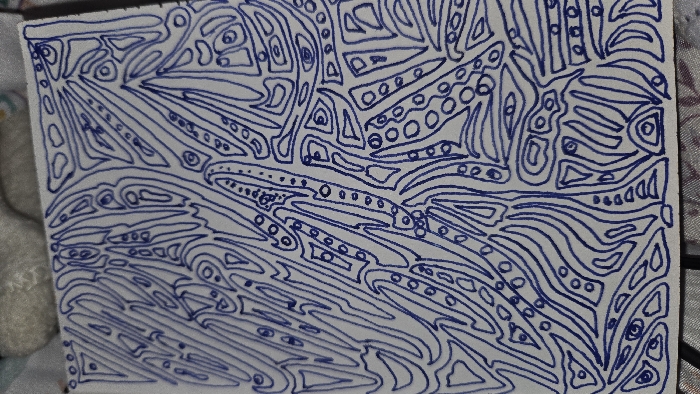 An abstract drawing in blue ink dominates a rectangular white surface. The composition features intricate, non-representational patterns resembling stylized cellular structures or complex networks. Shapes vary from elongated streaks dotted with circles to geometric forms enclosed by winding lines. The dense arrangement of lines creates a sense of depth and visual texture across the surface.