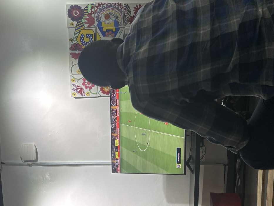 An individual, viewed from behind, is seated in an indoor setting in Abuja, Nigeria, observing a flat-screen television displaying a football (soccer) video game