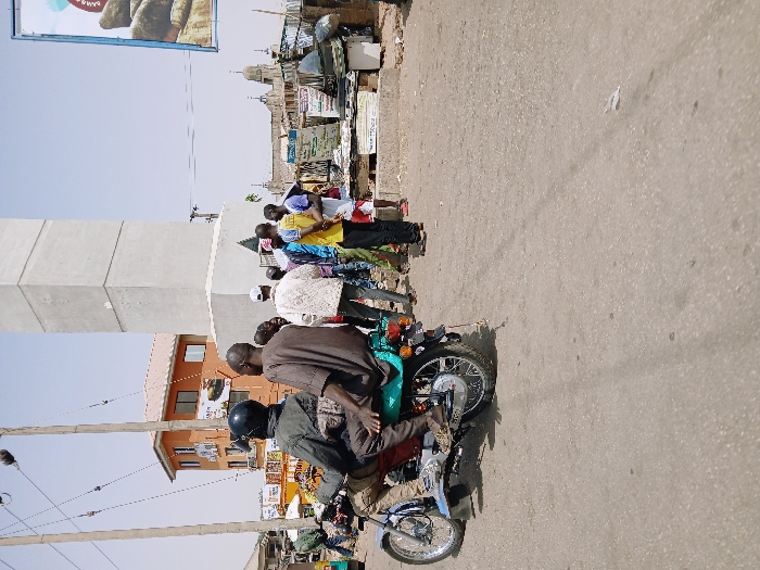 The image depicts a bustling urban street scene in Zambia, within the city of Kungulu School, under clear daylight conditions. In the immediate foreground, a grey asphalt road occupies the lower third of the frame. In the left midground, a blue and teal colored motorcycle is positioned, carrying two male occupants. The driver wears a black helmet, a dark long-sleeved shirt, and light-colored pants. The passenger, seated directly behind, wears a brown short-sleeved top and dark pants. Both individuals are facing away from the camera. Further into the midground, on the right side, stands a tall, light-grey concrete tower or monument with a wider base. Adjacent to its base, a group of approximately eight to ten men are gathered, standing and appearing to interact or observe their surroundings. They are dressed in various casual attire, including shirts, t-shirts, and pants. Behind this group and extending to the right, numerous makeshift market stalls or vendor setups are visible, displaying goods and featuring various signs with text and images. In the background, to the left of the concrete tower, a multi-story orange building with rectangular windows is visible. Overhead, multiple utility poles with a network of wires crisscross the sky. On the far right edge of the frame, a large, colorful vertical billboard with graphics of what appear to be food items or drinks is partially visible. The overall environment suggests a dry, sunny climate with a mix of permanent structures and informal commercial activity.