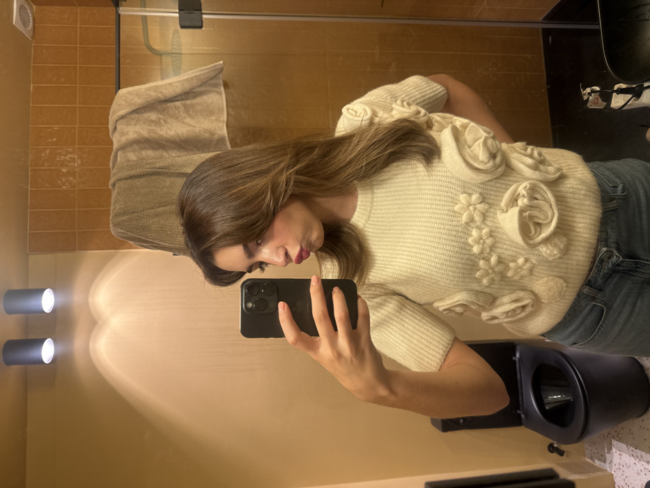 The scene depicts a private bathroom interior located in Porto, Portugal. A young female, appearing to be in her late teens or early twenties, with medium brown hair featuring face-framing layers, is captured in a mirror selfie. She holds a black smartphone with a triple-lens camera system in her right hand, aimed towards the mirror, while making a puckered facial expression. Her attire consists of a cream-colored, short-sleeved knitted sweater adorned with three-dimensional floral and rosette embellishments across the front, paired with light blue jeans. The bathroom walls are predominantly light beige, with a section of terracotta-colored square tiles visible on the right, suggesting a shower or wet area. Two black cylindrical spotlights are mounted on the ceiling, casting distinct conical light patterns on the wall. Reflected in the mirror, a dark-colored toilet with an open lid is visible in the lower-left corner, a light-colored towel is draped over a bar above and to the right of the subject's head, and a glass shower partition is discernible on the far right. The floor exhibits a light, speckled pattern. The precise street address or specific establishment within Porto is not discernible from the provided image.