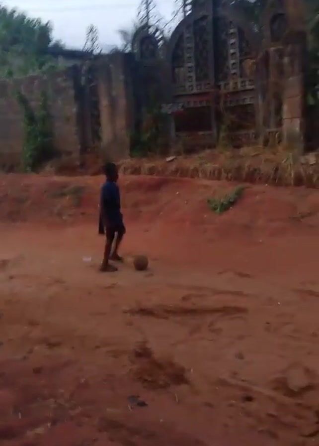 low-angle shot of two boys playing with a small brown ball on a dirt road. The road is reddish-brown and shows signs of recent rain, with visible tracks and uneven surfaces. A tall, decorative metal gate sits behind the boys, attached to a stone fence overgrown with some vegetation. The sky is overcast. A third person stands on the far left of the frame, only partially visible. The boy closest to the camera is wearing a dark blue shirt and dark shorts. The other boy wears a yellow t-shirt. He later changes his shirt to a red one. The boys kick the ball around, seemingly enjoying a casual game.