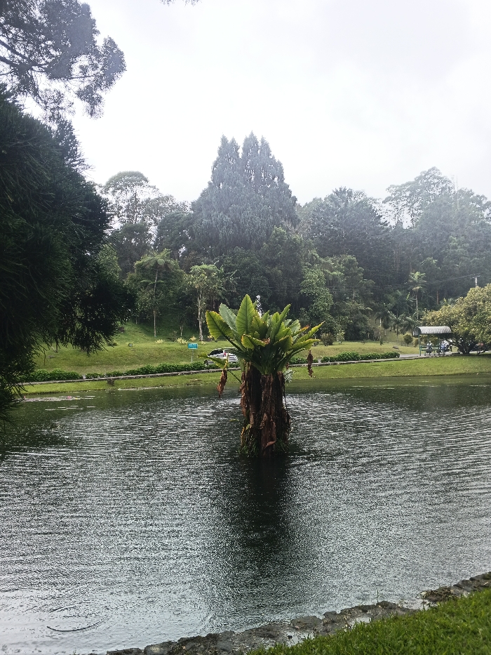 The image displays an outdoor scene within the city of Matopos, Zimbabwe, under an overcast sky. A body of water, likely a pond or lake, occupies the lower and central portions of the frame, its surface exhibiting ripples consistent with light rain or wind. Centrally within the water, a large plant with a thick, fibrous, dark brown trunk emerges, supporting a crown of broad, green, fern-like leaves, with dried brown fronds hanging from its base. A distinct reflection of this plant is visible on the water's surface. Beyond the water, a grassy slope rises gently, traversed by a paved path or low road. A light-colored vehicle, possibly a white SUV, is parked on the grass to the left of the central water plant, and a small blue sign is visible nearby. Further to the right along the bank, a covered structure, appearing as a shelter, houses several indistinct human figures. The background consists of a dense, multi-layered forest with various tree types, including several tall, dark green coniferous trees that stand prominently against the light grey, featureless sky. The overall environment is lush and verdant.
